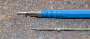 Commercially prepared stylus’ are available. 12 gauge silver wire, either sterling or fine silver,  and a mechanical lead pencil holder work very well. Alternate metal wires including gold and copper can be used. It may be necessary to improvised devises to hold these wires.