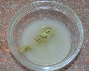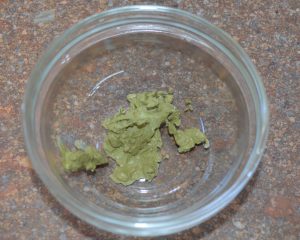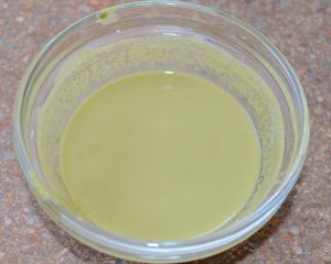 Green pigment made into paste                                                        Thin hide glue added to the pigment paste                              Glue and pigment mixed together